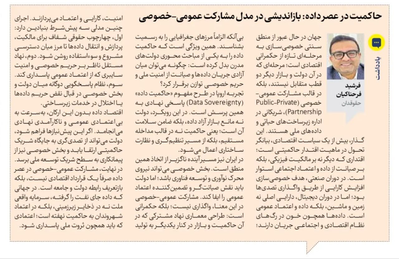 درنهایت، مشارکت عمومی–خصوصی در عصر داده صرفاً یک قرارداد اقتصادی نیست، بلکه بازتعریف رابطه دولت و جامعه است. در جهانی که داده جای نفت را گرفته، سرمایه واقعی ملت نه در ذخایر زیرزمینی، بلکه در اعتماد شهروندان به حاکمیت نهفته است؛ اعتمادی که باید همچون ثروت ملی پاسداری شود.