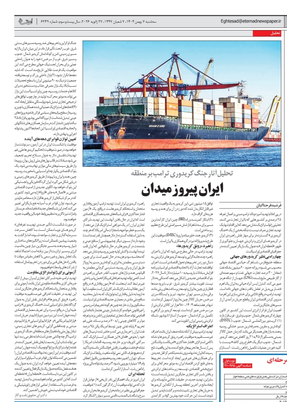 موفقیت یا شکست ایران در این آزمون، سرنوشتساز خواهد بود. در صورت موفقیت (تحکیم کریدورها علیرغم تهدیدات):· نقش دلار بهعنوان سلاح تحریم تضعیف میشود. مبادلات در قالب پولهای ملی (روبل، یوآن، روپیه) و از طریق سیستمهای مالی موازی نهادینه میشود. یک بلوک اقتصادی یکپارچه اوراسیایی با محوریت روسیه، چین، هند و ایران و با پیوند از طریق کریدورهای زمینی و دریایی شکل میگیرد. ایران گرهگاه فیزیکی و لجستیکی این بلوک خواهد بود. الگوی جدیدی از امنیت اقتصادی مبتنی بر «اتصال» بهجای «انزوا» ارائه میشود. کشوری که در مرکز شبکهای از کریدورها قرار دارد، محاصرهناپذیر میشود. توازن قوا در غرب آسیا به نفع بازیگرانی تغییر میکند که در این شبکههای جدید ادغامشدهاند. عربستان و امارات نیز ناگزیر به تنظیم روابط خود با این واقعیت جدید خواهند بود.