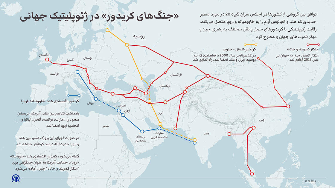 اهمیت ایران فراتر از انرژی است. این کشور در کانون چهارراه کریدورهای شمال-جنوب و شرق-غرب قرار دارد: (1) کریدور بینالمللی شمال-جنوب (INSTC) :کوتاهترین و مقرون بهصرفهترین مسیر خشکی روسیه و هند به بازارهای همدیگر میباشد که زمان حمل کالا از بمبئی به مسکو را از ۴۵ به ۲۱ روز کاهش میدهد. کریدور شمال-جنوب دیگر یک «طرح روی کاغذ» نیست. با کلید خوردن عملیات تکمیل راهآهن رشت-آستارا و توافق ۱۵ میلیون تنی، این کریدور به یک واقعیت تجاری غیرقابلانکار بدل شده که دور زدن آن برای هند و روسیه هزینهای گزاف دارد .(2) ابتکار کمربند و راه (BRI) چین: ایران کارآمدترین مسیر برای سه شاهراه از شش مسیر اصلی این طرح عظیم زیرساختی است. (3) کریدور هند، خاورمیانه و اروپا (IMEC): موفقیت این طرح بلندپروازانه نیز درگرو همکاری با ایران است.
