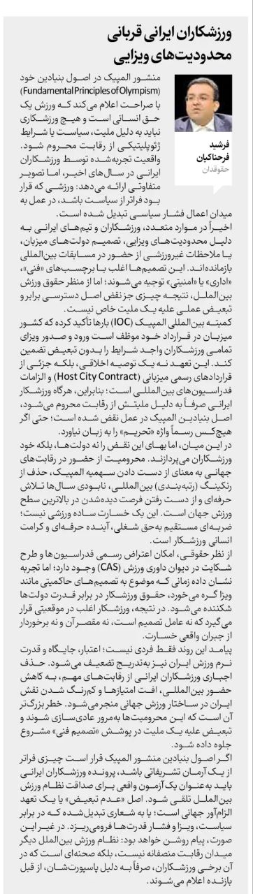 گزیده جستار: . اصل «عدم تبعیض» یا یک تعهد الزامآور جهانی است؛ یا به شعاری تبدیلشده که در برابر سیاست، ویزا و فشار قدرتها فرومیریزد. در غیر این صورت، پیام روشن خواهد بود: نظام ورزش بینالملل دیگر میدان رقابت منصفانه نیست؛ بلکه صحنهای است که در آن برخی ورزشکاران، صرفاً به دلیل پاسپورتشان، از قبل بازنده اعلام میشوند.