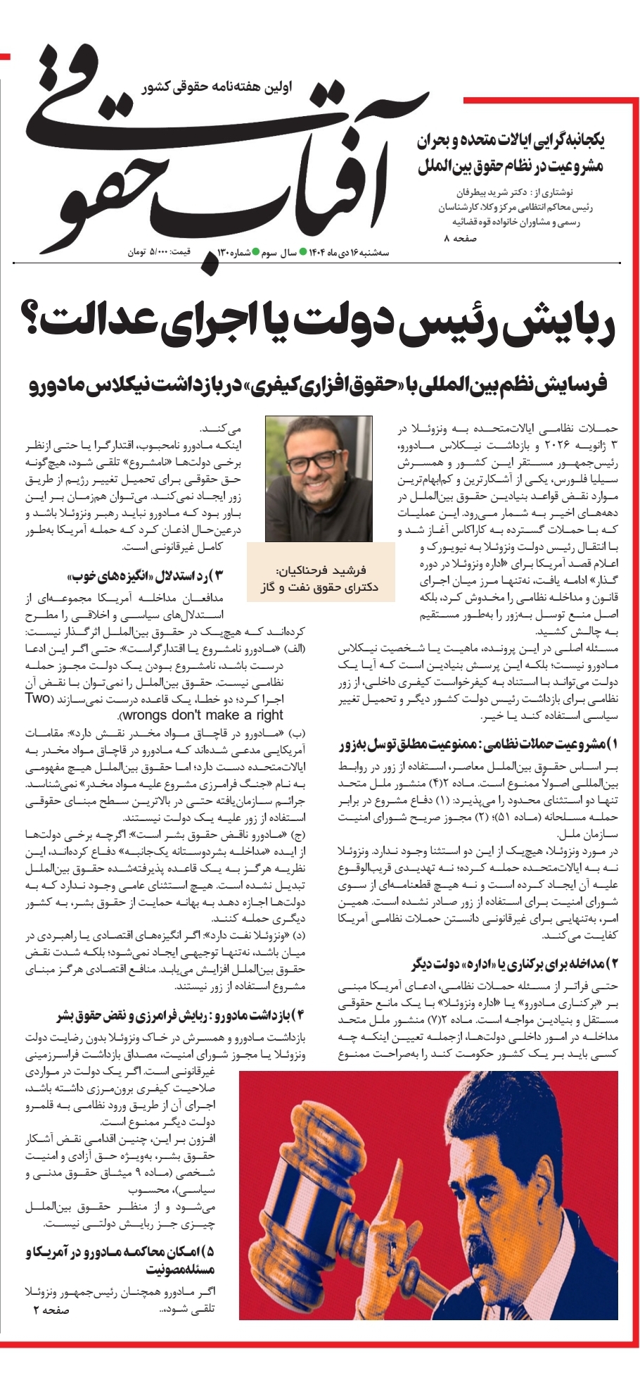 مسئله اصلی در این پرونده، ماهیت یا شخصیت نیکلاس مادورو نیست؛ بلکه این پرسش بنیادین است که آیا یک دولت میتواند با استناد به کیفرخواست کیفری داخلی، از زور نظامی برای بازداشت رئیس دولت کشور دیگر و تحمیل تغییر سیاسی استفاده کند یا خیر.