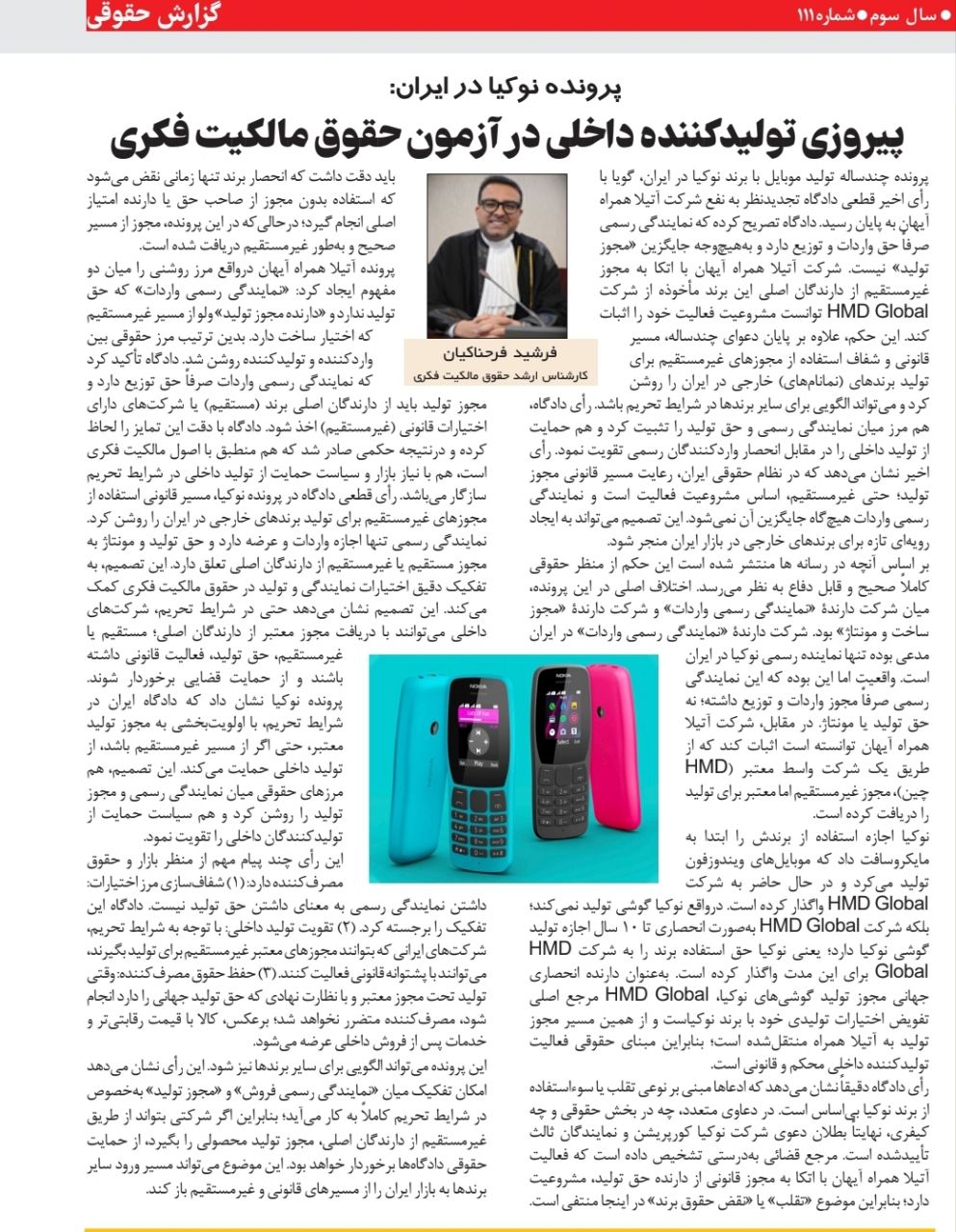 پرونده چندساله تولید موبایل با برند نوکیا در ایران، گویا با رأی اخیر قطعی دادگاه تجدیدنظر به نفع شرکت آتیلا همراه آیهان به پایان رسید. از رای دادگاه برمیآید که نمایندگی رسمی صرفاً حق واردات و توزیع دارد و بههیچوجه جایگزین «مجوز تولید» نیست. شرکت آتیلا همراه آیهان با اتکا به مجوز غیرمستقیم از دارندگان اصلی این برند مأخوذه از شرکت HMD Global توانست مشروعیت فعالیت خود را اثبات کند. این حکم، علاوه بر پایان دعوای چندساله، مسیر قانونی و شفاف استفاده از مجوزهای غیرمستقیم برای تولید برندهای (نمانامهای) خارجی در ایران را روشن کرد و میتواند الگویی برای سایر برندها در شرایط تحریم باشد. رأی دادگاه، هم مرز میان نمایندگی رسمی و حق تولید را تثبیت کرد و هم حمایت از تولید داخلی را در مقابل انحصار واردکنندگان رسمی تقویت نمود. رأی اخیر نشان میدهد که در نظام حقوقی ایران، رعایت مسیر قانونی مجوز تولید؛ حتی غیرمستقیم، اساس مشروعیت فعالیت است و نمایندگی رسمی واردات هیچگاه جایگزین آن نمیشود. این تصمیم میتواند به ایجاد رویهای تازه برای برندهای خارجی در بازار ایران منجر شود.
