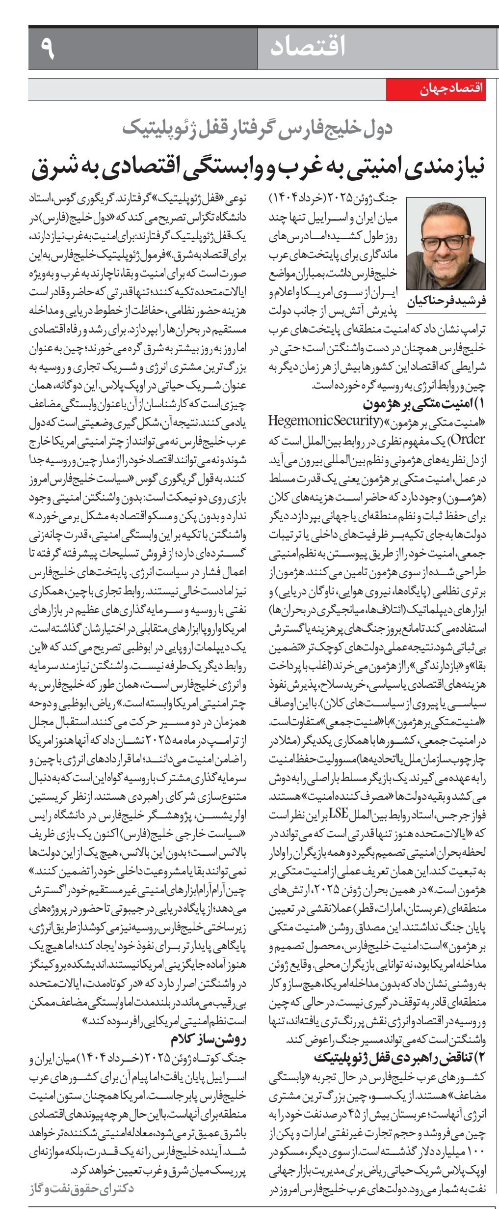 فواز جرجس؛ استاد روابط بینالملل LSE، براین نظر است که «ایالاتمتحده هنوز تنها قدرتی است که میتواند در لحظه بحران امنیتی تصمیم بگیرد و همه بازیگران را وادار به تبعیت کند. این همان تعریف عملی از امنیت متکی بر هژمون است.» در همین بحران ژوئن ۲۰۲۵، ارتشهای منطقهای (عربستان، امارات، قطر) عملاً نقشی در تعیین پایان جنگ نداشتند. این مصداق روشن «امنیت متکی بر هژمون» است: امنیت خلیجفارس، محصول تصمیم و مداخله آمریکا بود، نه توانایی بازیگران محلی. وقایع ژوئن بهروشنی نشان داد که بدون مداخله آمریکا، هیچ سازوکار منطقهای قادر به توقف درگیری نیست. درحالیکه چین و روسیه در اقتصاد و انرژی نقش پررنگتری یافتهاند، تنها واشنگتن است که میتواند مسیر جنگ را عوض کند.