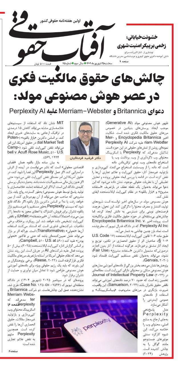 ظهور هوش مصنوعی مولد (Generative AI) موجب ایجاد پرسشهای بنیادین در خصوص مرزهای حقوق مالکیت فکری شده است. شکایت اخیر Encyclopedia Britannica و Merriam-Webster علیه شرکت Perplexity AI نمونهای روشن از تنشهای حقوقی در این حوزه است. شاکیان مدعیاند که Perplexity با اسکرپینگ محتوای وب (گردآوری از وب، برداشت وب یا استخراج دادههای وب، نوعی تراشدادن داده است که داده را از وبسایت استخراج میکند)، کپیبرداری و بازتولید غیرمجاز آثار، حقوق کپیرایت و علائم تجاری آنها را نقض کرده است. در ادامه با بررسی ابعاد حقوقی پرونده و تحلیل تطبیقی آن با نظریات حقوقی موجود، نشان داده میشود که این دعوا میتواند بهعنوان یک نقطه عطف در بازتعریف «استفاده مشروع» و «بازار بالقوه» در نظام کپیرایت ایالاتمتحده ایفای نقش کند.