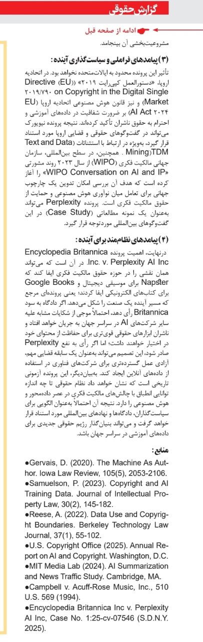 (3) پیامدهای فراملی و سیاستگذاری آینده: تأثیر این پرونده محدود به ایالاتمتحده نخواهد بود. در اتحادیه اروپا، «دستورالعمل کپیرایت ۲۰۱۹» (Directive (EU) 2019/790 on Copyright in the Digital Single Market) و نیز قانون هوش مصنوعی اتحادیه اروپا (EU AI Act 2024) بر ضرورت شفافیت در دادههای آموزشی و احترام به حقوق ناشران تأکید کردهاند. نتیجه پرونده نیویورک میتواند در گفتوگوهای حقوقی و قضایی اروپا مورد استناد قرار گیرد، بهویژه در ارتباط با استثنائات (Text and Data Mining)TDM . همچنین، در سطح بینالمللی، سازمان جهانی مالکیت فکری (WIPO) از سال ۲۰۲۳ روند مشورتی «WIPO Conversation on AI and IP» را آغاز کرده است که هدف آن بررسی امکان تدوین یک چارچوب جهانی برای تعامل میان نوآوری هوش مصنوعی و حمایت از حقوق مالکیت فکری است. پرونده Perplexity میتواند بهعنوان یک نمونه مطالعاتی (Case Study) در این گفتوگوهای بینالمللی موردتوجه قرار گیرد.