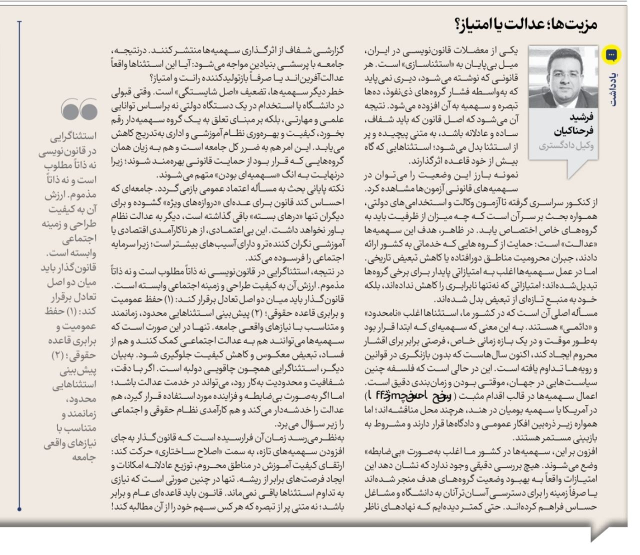 بهنظر میرسد زمان آن فرارسیده که قانونگذار بهجای افزودن سهمیههای تازه، به سمت «اصلاح ساختاری» حرکت کند: ارتقای کیفیت آموزش در مناطق محروم، توزیع عادلانه امکانات و ایجاد فرصتهای برابر از ریشه. تنها در چنین صورتی است که نیازی به تداوم استثناها باقی نمیماند. قانون باید قاعدهای عام و برابر باشد؛ نه متنی پر از تبصره که هر کس سهم خود را از آن مطالبه کند!