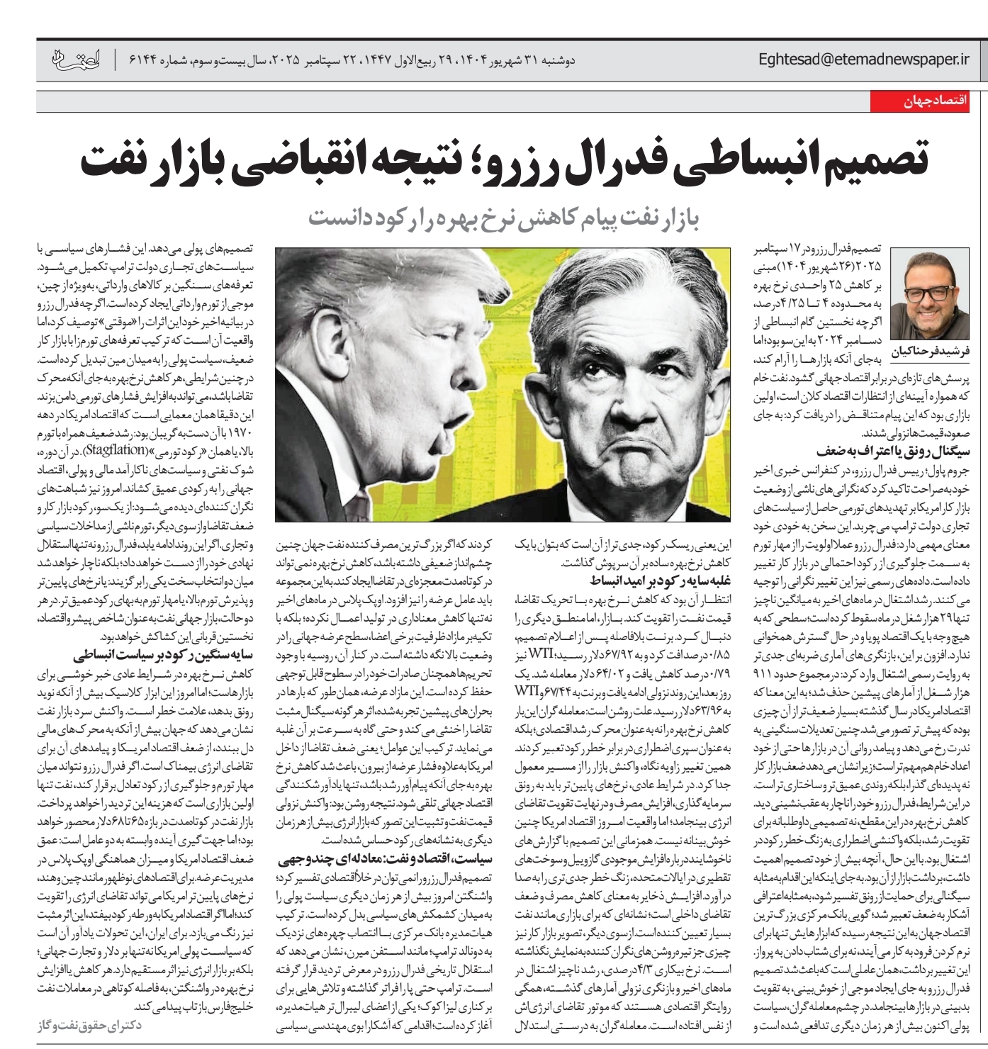 تصمیم فدرال رزرو در ۱۷ سپتامبر ۲۰۲۵ (26 شهریور 1404) مبنی بر کاهش ۲۵ واحدی نرخ بهره به محدوده ۴ تا 25/ 4 درصد، اگرچه نخستین گام انبساطی از دسامبر ۲۰۲۴ به اینسو بود؛ اما بهجای آنکه بازارها را آرام کند، پرسشهای تازهای در برابر اقتصاد جهانی گشود. نفت خام که همواره آیینهای از انتظارات اقتصاد کلان است، اولین بازاری بود که این پیام متناقض را دریافت کرد: بهجای صعود، قیمتها نزولی شدند.