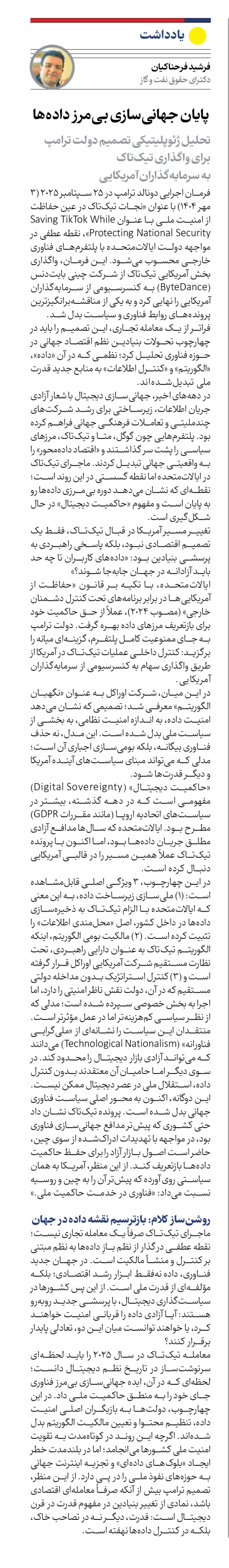 در دهههای اخیر، جهانیسازی دیجیتال با شعار آزادی جریان اطلاعات، زیرساختی برای رشد شرکتهای چندملیتی و تعاملات فرهنگی جهانی فراهم کرده بود. پلتفرمهایی چون گوگل، متا و تیکتاک، مرزهای سیاسی را پشت سر گذاشتند و «اقتصاد دادهمحور» را به واقعیتی جهانی تبدیل کردند. ماجرای تیکتاک در ایالاتمتحده اما نقطه گسستی در این روند است؛ نقطهای که نشان میدهد دورهی بیمرزی دادهها رو به پایان است و مفهوم «حاکمیت دیجیتال» در حال شکلگیری است.