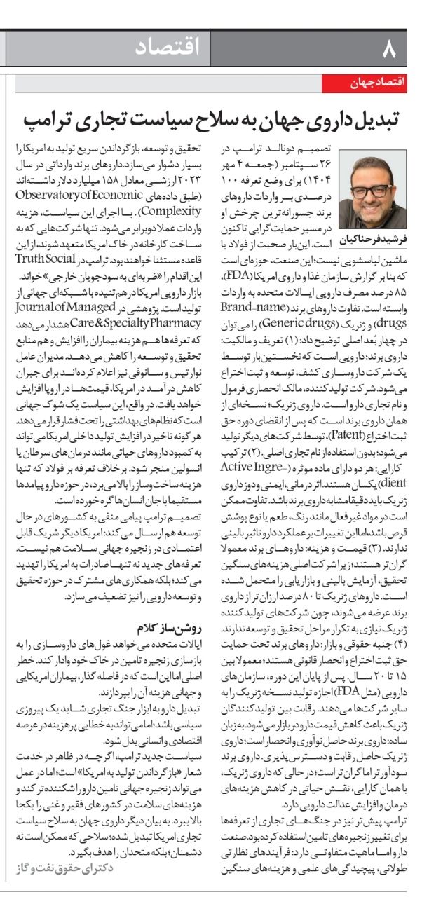 سیاست جدید ترامپ، اگرچه در ظاهر در خدمت شعار «بازگرداندن تولید به آمریکا» است؛ اما در عمل میتواند زنجیره جهانی تأمین دارو را شکنندهتر کند و هزینههای سلامت در کشورهای فقیر و غنی را یکجا بالا ببرد. بهبیاندیگر، داروی جهان به سلاح سیاست تجاری آمریکا تبدیلشده است؛ سلاحی که ممکن است نه دشمنان؛ بلکه متحدان را هدف بگیرد.