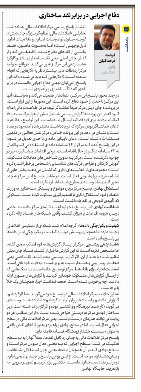 پاسخ مرکز اطلاعات مالی؛ بهجای رد کامل نقدها، عملاً آنها را به دو سطح تفکیک میکند: سطح اجرایی که در آن مرکز فعال بوده و سطح نهادی که در آن همچنان با ضعف استقلال، شفافیت و پیشهشدار مواجه است. از همین رو، این پاسخ را باید توضیحی اداری در برابر نقدی ساختاری دانست؛ تلاشی برای ترمیم تصویر بیرونی، نه بازتعریف جایگاه نهادی.