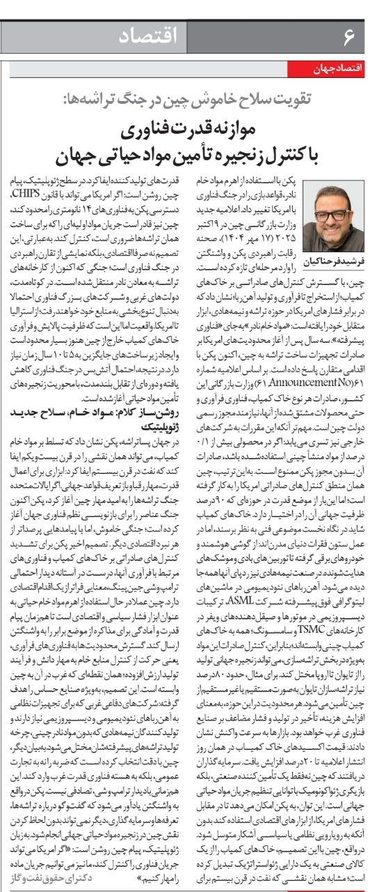 پکن با استفاده از اهرم مواد خام نادر، قواعد بازی را در جنگ فناوری با آمریکا تغییر داد. اعلامیه جدید وزارت بازرگانی چین در ۹ اکتبر ۲۰۲۵ (17 مهر 1404)، صحنه رقابت راهبردی پکن و واشنگتن را وارد مرحلهای تازه کرده است. چین، با گسترش کنترلهای صادراتی بر خاکهای کمیاب؛ از استخراج تا فرآوری و تولید آهنربا؛ نشان داد که در برابر فشارهای آمریکا در حوزه تراشه و نیمههادی، ابزار متقابل خود را یافته است: «مواد خام نادر» بهجای «فناوری پیشرفته».