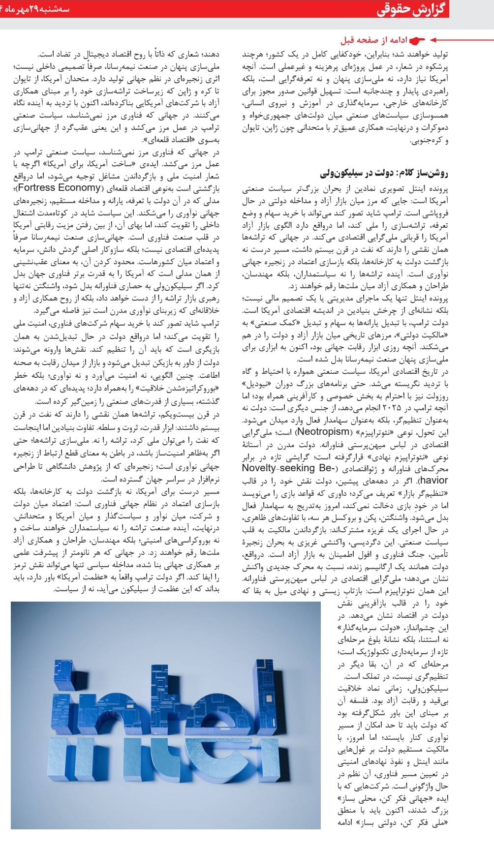 در جهانی که فناوری مرز نمیشناسد، سیاست صنعتی ترامپ در عمل مرز میکشد. ایدهی «ساخت آمریکا، برای آمریکا» اگرچه با شعار امنیت ملی و بازگرداندن مشاغل توجیه میشود، اما درواقع بازگشتی است بهنوعی اقتصاد قلعهای (Fortress Economy)؛ مدلی که در آن دولت با تعرفه، یارانه و مداخله مستقیم، زنجیرههای جهانی نوآوری را میشکند. این سیاست شاید در کوتاهمدت اشتغال داخلی را تقویت کند، اما بهای آن، از بین رفتن مزیت رقابتی آمریکا در قلب صنعت فناوری است. جهانیسازی صنعت نیمهرسانا صرفاً پدیدهای اقتصادی نیست؛ بلکه سازوکار اصلی گردش دانش، سرمایه و اعتماد میان کشورهاست. محدود کردن آن، به معنای عقبنشینی از همان مدلی است که آمریکا را به قدرت برتر فناوری جهان بدل کرد. اگر سیلیکونولی به حصاری فناورانه بدل شود، واشنگتن نهتنها رهبری بازار تراشه را از دست خواهد داد، بلکه از روح همکاری آزاد و خلاقانهای که زیربنای نوآوری مدرن است نیز فاصله میگیرد.