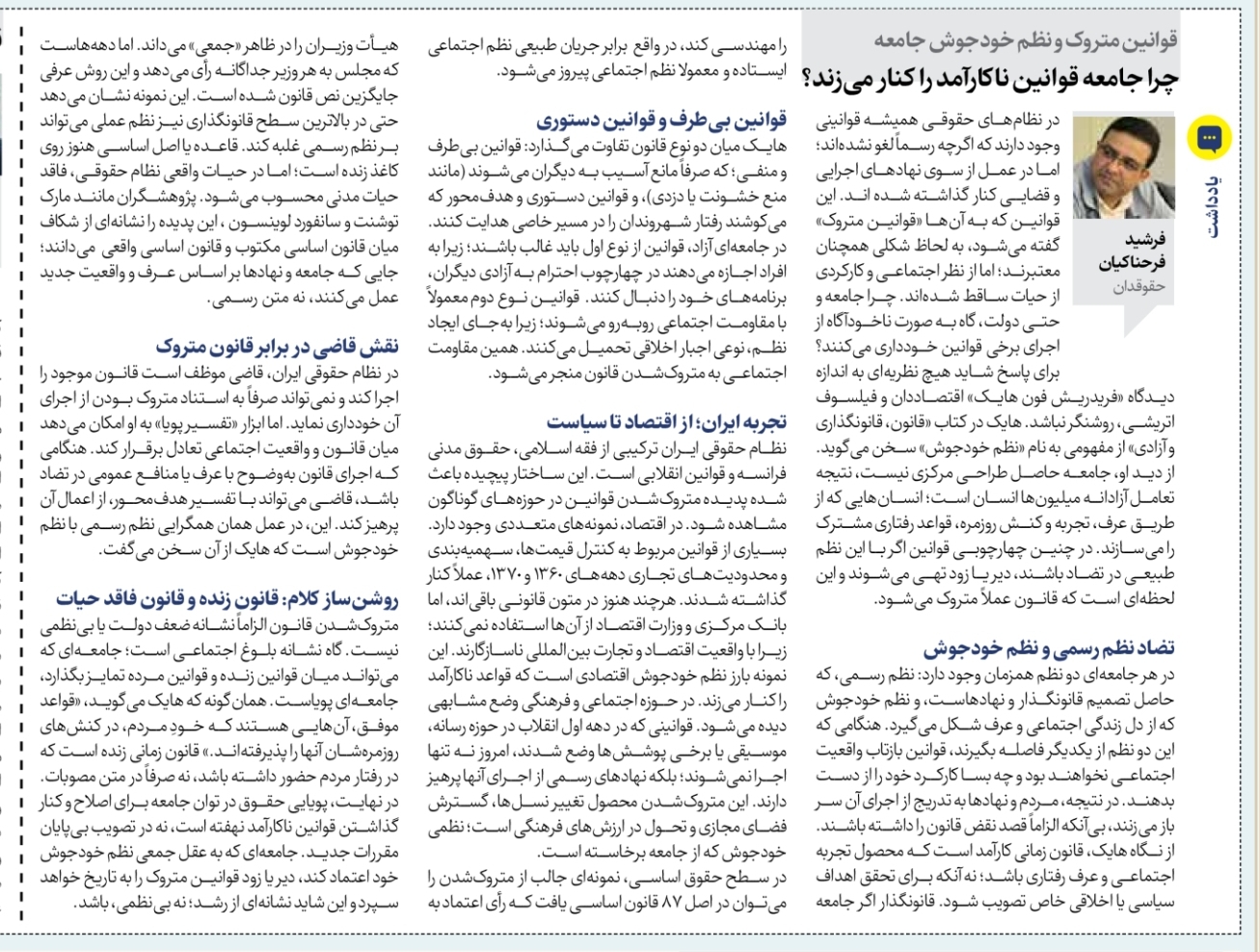 متروکشدن قانون الزاماً نشانه ضعف حکومت یا بینظمی نیست. گاه نشانه بلوغ اجتماعی است؛ جامعهای که میتواند میان قوانین زنده و قوانین مرده تمایز بگذارد، جامعهای پویاست. همانگونه که هایک میگوید، «قواعد موفق، آنهایی هستند که خودِ مردم، در کنشهای روزمرهشان آنها را پذیرفتهاند.» قانون زمانی زنده است که در رفتار مردم حضور داشته باشد، نه صرفاً در متن مصوبات.