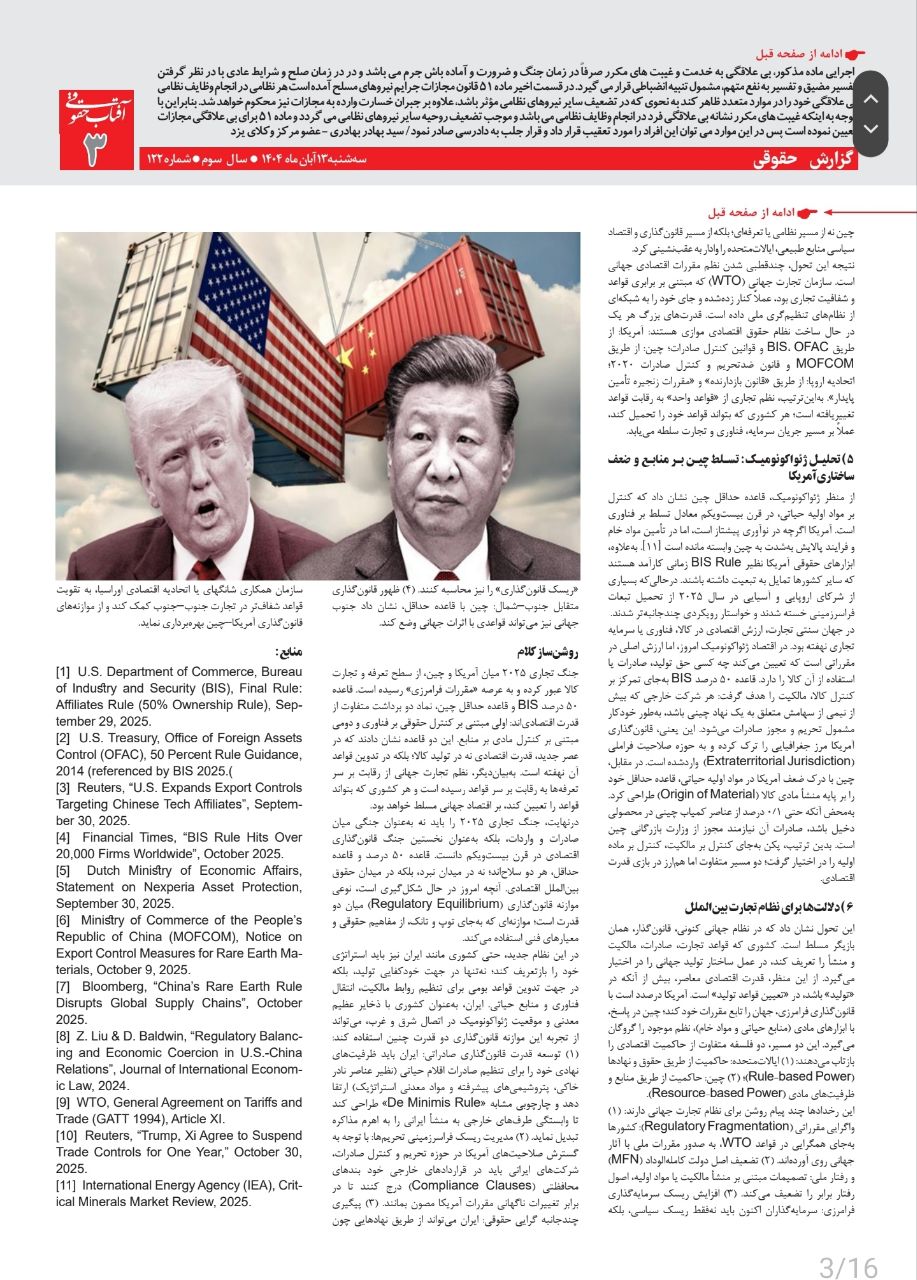 در دهههای اخیر، رقابت ایالاتمتحده و چین از سطح تجاری و تعرفهای فراتر رفته و به مرحلهای رسیده که حقوق بینالملل اقتصادی، مقررات صادرات و حتی ساختارهای مالکیتی شرکتها به ابزارهای قدرت ژئواکونومیک تبدیلشدهاند. در این میان، تصویب قاعده ۵۰ درصد اداره صنایع و امنیت آمریکا (BIS 50% Rule) در سپتامبر ۲۰۲۵ و پاسخ متقابل چین با قاعده حداقل 1/ 0 درصد (De Minimis Rule) در اکتبر همان سال، نقطه اوج یک «جنگ قانونگذاری اقتصادی» بود که پیامدهای آن، از صنایع نیمههادی گرفته تا بازار جهانی سویا، نظم تجارت جهانی را متزلزل کرد.