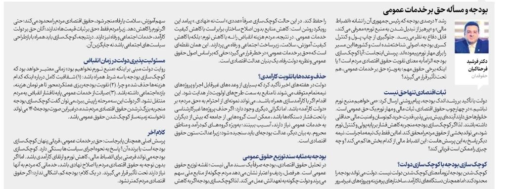 گزیده جستار: درنهایت، پرسش اصلی همچنان پابرجاست: حق بر خدمات عمومی، قربانی پنهان کوچکسازی بودجه است یا برنده آن؟ پاسخ به نحوه اجرای سیاستها بستگی دارد. کوچکسازی بودجه میتواند فرصتی برای انضباط مالی، کاهش تورم و ارتقای کارآمدی باشد؛ اما اگر بدون توجه به حقوق اقتصادی مردم و بدون اصلاح نهادی اجرا شود، نخستین قربانی آن خدماتی خواهد بود که زندگی روزمره مردم به آن وابسته است: سلامت، آموزش، تأمین اجتماعی و رفاه پایه. در یک کلام، بودجه کم اشکالی ندارد؛ اگر حقوق اقتصادی مردم کمتر نشود.