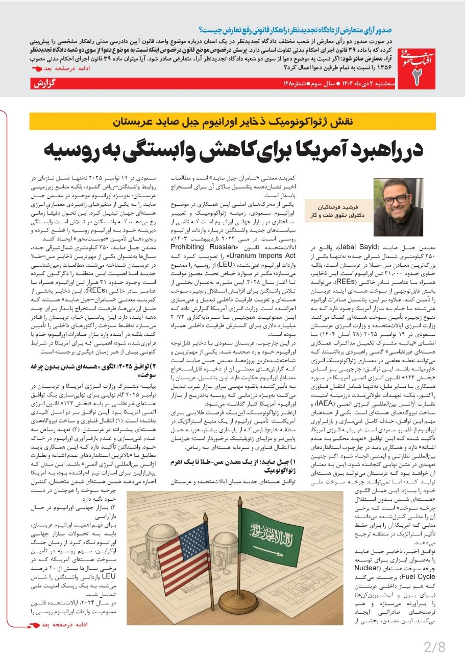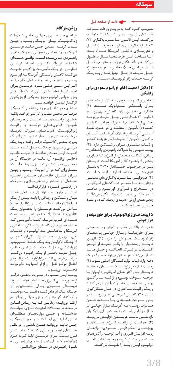در نظم جدید انرژی جهانی؛ جایی که رقابت ژئواکونومیک میان آمریکا، روسیه و چین شدت گرفته، معدن جبل صاید عربستان از یک پروژه معدنی معمولی به یک متغیر راهبردی تبدیلشده است. توافق هستهای ۲۰۲۵ میان واشنگتن و ریاض نقش این ذخایر را در یک مأموریت بزرگتر تثبیت میکند: کاهش وابستگی آمریکا به اورانیوم روسیه و بازطراحی نظم هستهای خاورمیانه. اگر این مسیر عملی شود، عربستان برای نخستینبار نهفقط در بازار نفت، بلکه در بازار جهانی اورانیوم نیز به یکی از بازیگران اثرگذار تبدیل خواهد شد.