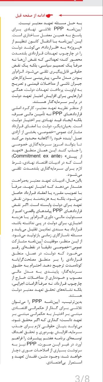 بدینترتیب، آییننامه PPP را میتوان تلاشی برای گذار از حکمرانی اقتصادی مبتنی بر اختیار به حکمرانی مبتنی بر تعهد دانست؛ گذاری که اگر محقق شود، میتواند بنیان حقوقی لازم برای جذب سرمایه، افزایش بهرهوری و تحقق اهداف توسعهای برنامه هفتم پیشرفت را فراهم آورد. در غیر این صورت، PPP نیز به سرنوشت بسیاری از اصلاحات صوری دچار خواهد شد: وجود متن، فقدان تعهد و استمرار بیاعتمادی.